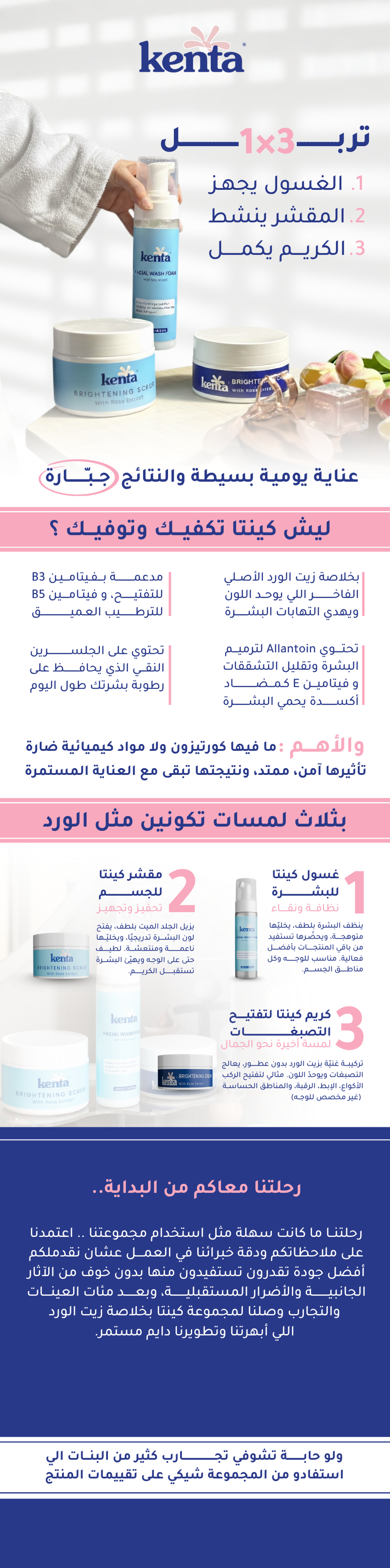لقد تمت إضافة زيت الورد الفاخر اﻷصلي وهو نجم المجموعة والذي له الدور الكبير في توحيد لون البشرة وتقليل الالتهابات وترطيب البشرة ،